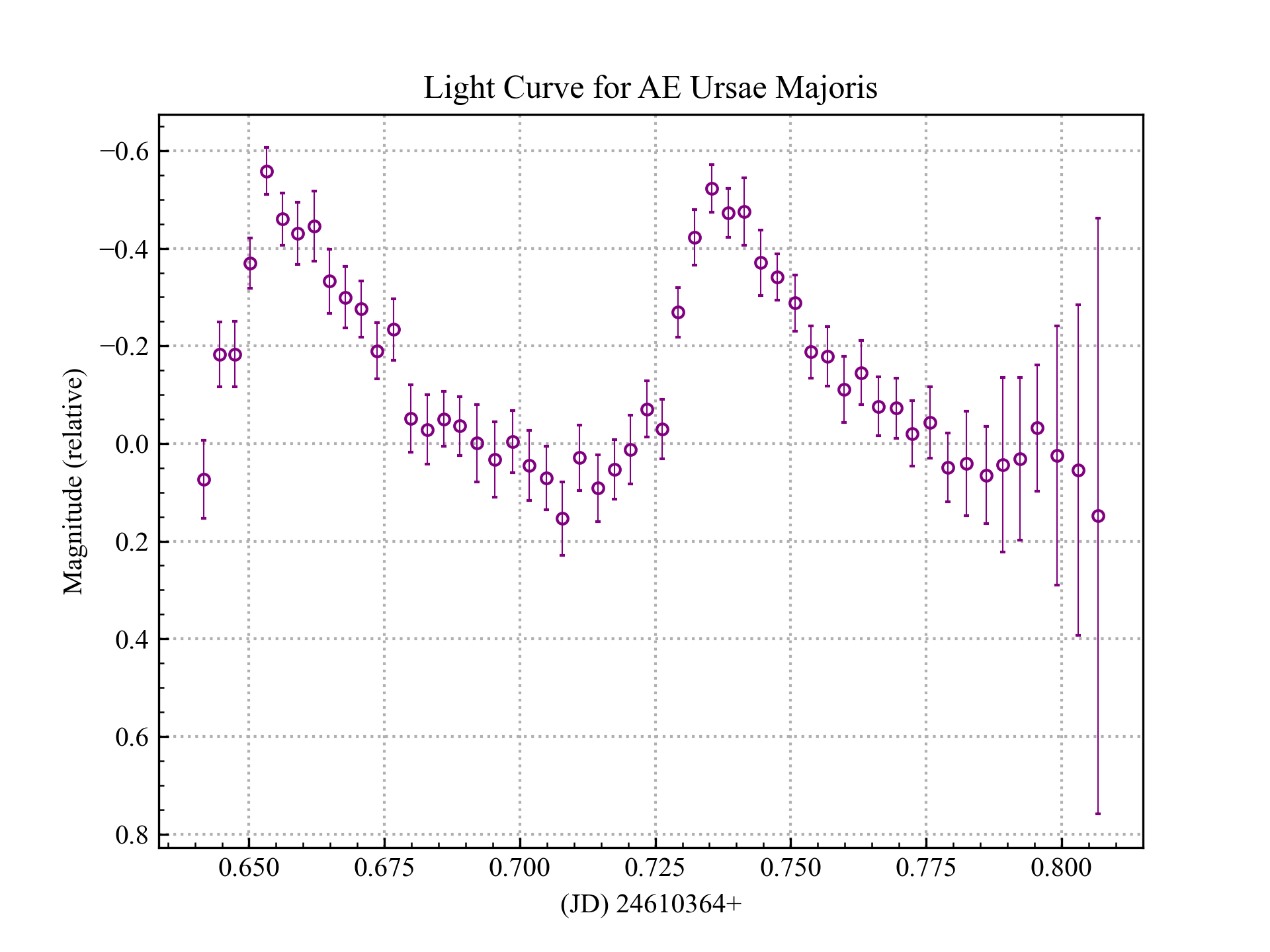 I have been increasingly interested in using telescopes for quantitative data collection, rather than simply producing images. For my first light curve, I chose a variable star with a short period, enabling me to collect enough data within one night. AE Ursae Majoris is such a star that peaks every couple of hours and remains high throughout the night.