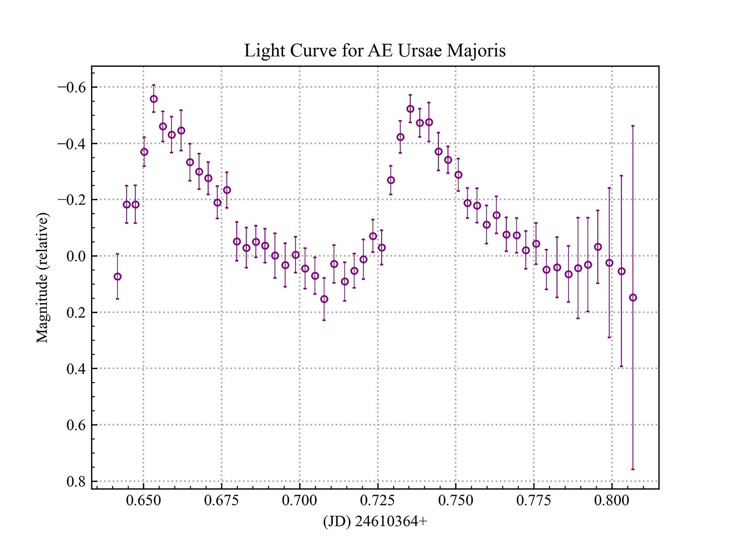 On the morning of the 27th of December, I took 1,174 10s exposures of AE UMa between 03:21 and 07:33. To increase the signal-to-noise ratio, I stacked every 20 frames together. Using the Siril software to perform photometry on AE UMa, I subtracted changes in brightness based on four similarly-bright reference stars, removing any uncertainty from sources like clouds briefly passing and obscuring the star.