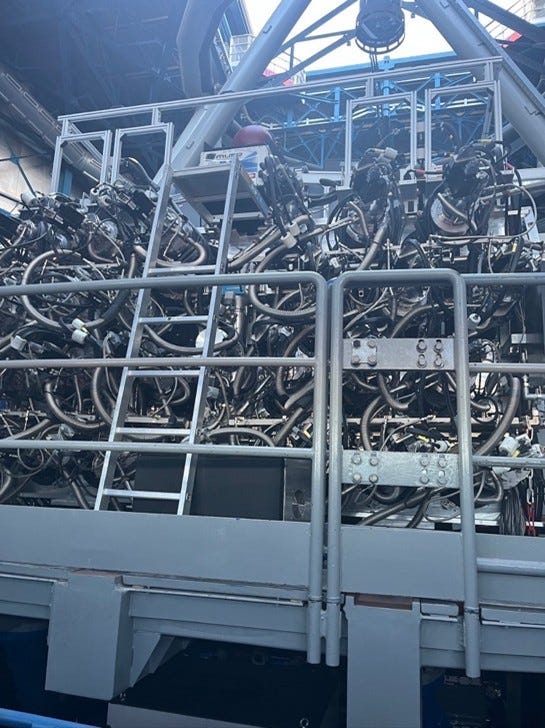 Our first stop was Paranal Observatory in the North of Chile. This is a remote location in in the Atacama Desert, with red/brown, dry land as far as the eye can see. The observatory is at an altitude of 2600m – not super high but enough to feel out of breath if you try to walk fast up stairs! There are four 8m-diameter telescopes at Paranal that make up the Very Large Telescope (VLT). We went inside one of the domes at sunset and saw the telescope being prepared for night-time observing. The MUSE instrument is attached to the side of the telescope, looking like a tangle of tubes and wires. These are the instrument’s cooling system and electronics. Inside the box is one of the most impressive astronomical instruments in the world – an “integral field spectrograph” that can take a spectrum of every point in an image over a 1 arcminute square field of view.