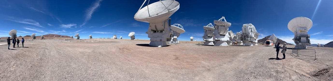 The final stop of our tour was the ALMA observatory. This is an interferometer that operates at sub-mm wavelengths (very short-wavelength radio waves). There are 66 dishes in the array, with diameters either 12m or 7m. The telescopes’ signals are combined electronically by a correlator computer. The main thing you notice when visiting is the altitude – ALMA is at 5000m. We all had to pass a medical check before going up, and we were given supplemental oxygen that to breathe from tanks in our backpacks. The site is also very dry, which is important because water in the atmosphere absorbs radiation at the wavelengths of ALMA’s observing range.
